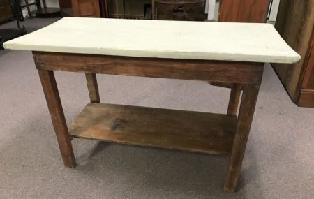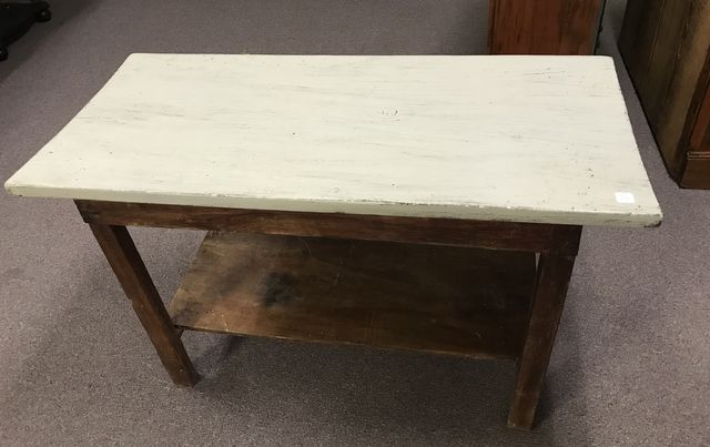Primitive Hand Made Small Table, painted white top, two tier, needs tightening, 27"h., 44"w., 20"d. Primitive Hand Made Small Table, painted white top, two tier, needs tightening, 27"h., 44"w., 20"d.