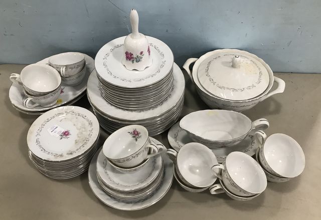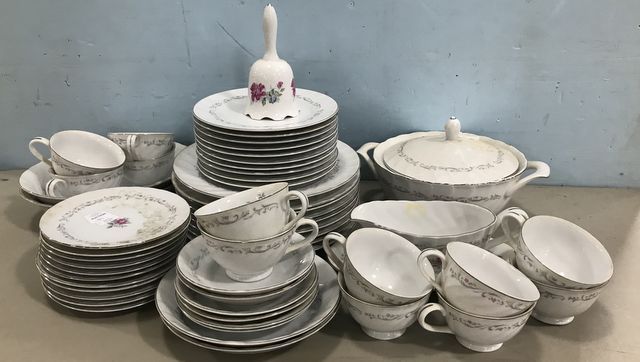 Royal Swirl Fine China Set, made in China, porcelain, needs cleaning, 9 dinner plates, 10 salad plates, 11 dessert plates, 4 saucers, gravy boat, bell, tureen, two serving bowls, 12 cups. Royal Swirl Fine China Set, made in China, porcelain, needs cleaning, 9 dinner plates, 10 salad plates, 11 dessert plates, 4 saucers, gravy boat, bell, tureen, two serving bowls, 12 cups.