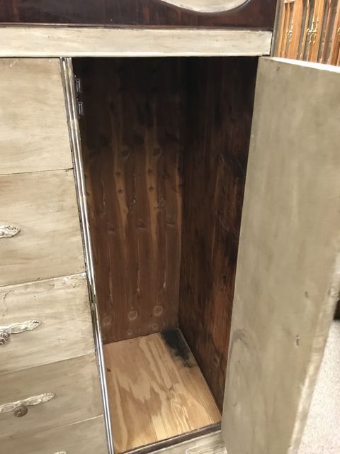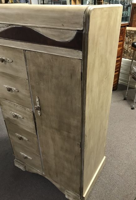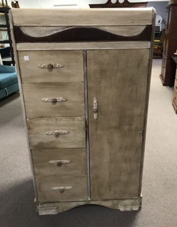 Painted Depression Era Chifferobe, walnut, painted distressed white, single door, five drawers, 62"h., 34"w., 20"d. Painted Depression Era Chifferobe, walnut, painted distressed white, single door, five drawers, 62"h., 34"w., 20"d.