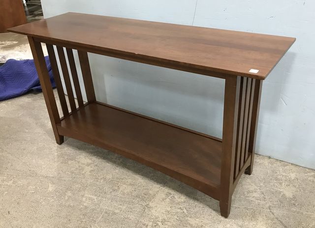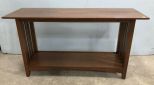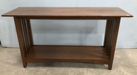 Modern Mid Century Style Sofa Table, two tier, has light scratches in clear coat, 29"h., 54"w., 17"d. Modern Mid Century Style Sofa Table, two tier, has light scratches in clear coat, 29"h., 54"w., 17"d.