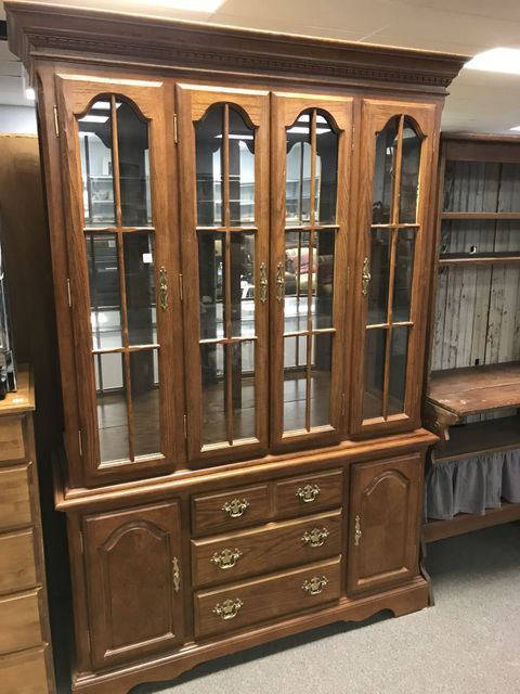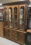 Modern oak china cabinet, two piece, quad door two glass shelves, 3 drawers, lighted, 81"h., 54"w., 16"d. Modern oak china cabinet, two piece, quad door two glass shelves, 3 drawers, lighted, 81"h., 54"w., 16"d.
