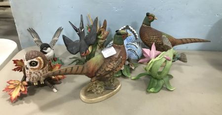 Hand painted ceramic animal figurines, pheasants, owls, birds, 8 total. Hand painted ceramic animal figurines, pheasants, owls, birds, 8 total.