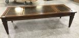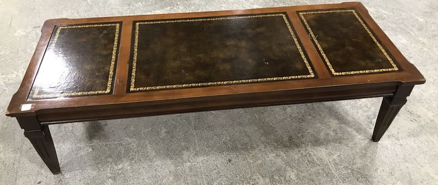 French Provincial Leather Top Coffee Table, cherry, three leather lined section, has some scratches on finish, 14"h., 52"w., 20"d French Provincial Leather Top Coffee Table, cherry, three leather lined section, has some scratches on finish, 14"h., 52"w., 20"d