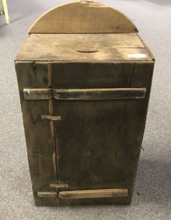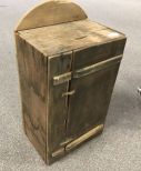 Antique Hand Made Hanging Wall Cabinet, made out of old crate, single door, leather hinges, one shelf, 25"h., 14"w., 10"d. Antique Hand Made Hanging Wall Cabinet, made out of old crate, single door, leather hinges, one shelf, 25"h., 14"w., 10"d.
