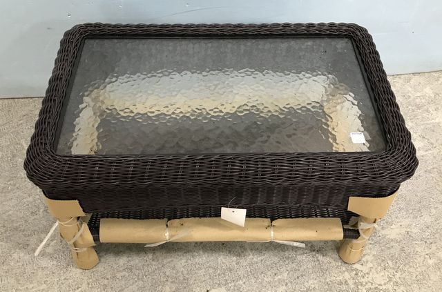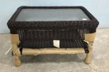 Green Resin Wicker Coffee Table, glass insert, two tier, new condition, 17"h., 29"w., 17"d. Green Resin Wicker Coffee Table, glass insert, two tier, new condition, 17"h., 29"w., 17"d.