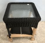 Green resin side table, glass insert, two tier, new condition, 22"h., 17"w. Green resin side table, glass insert, two tier, new condition, 22"h., 17"w.