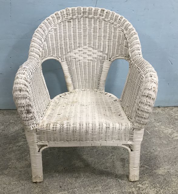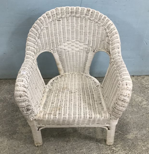 White Wicker Patio Arm Chair, has some paint chipping, 29"h. White Wicker Patio Arm Chair, has some paint chipping, 29"h.