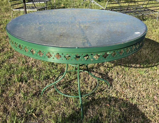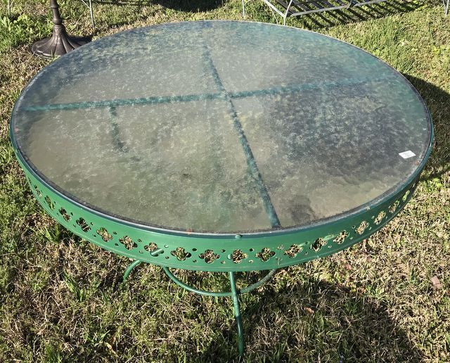 Round glass top patio table, metal base. Round glass top patio table, metal base.