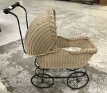 Vintage Doll Stroller, painted wicker, iron frame, wheel are working order, 24"h., 23"w. Vintage Doll Stroller, painted wicker, iron frame, wheel are working order, 24"h., 23"w.