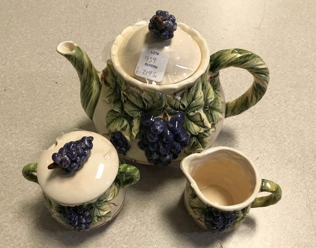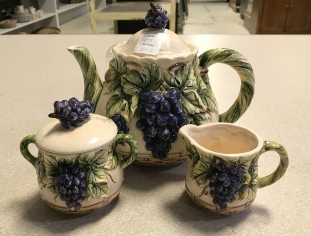 Hand Painted Takahaski Tea Set, pitcher, sugar, and creamer, grape pattern. Hand Painted Takahaski Tea Set, pitcher, sugar, and creamer, grape pattern.