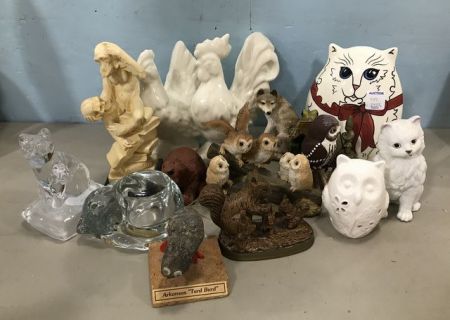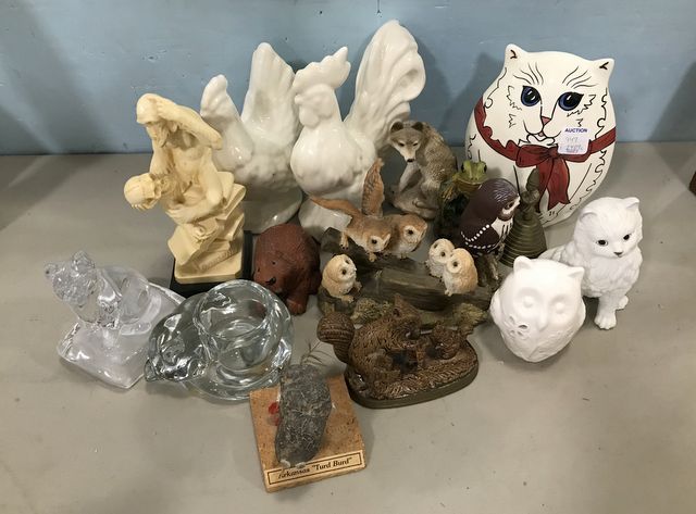Resin monkey statue, glass cats, ceramic rooster, wolf, owls, beaver, rabbit, ceramic cats. Resin monkey statue, glass cats, ceramic rooster, wolf, owls, beaver, rabbit, ceramic cats.
