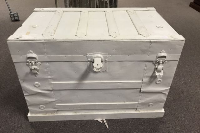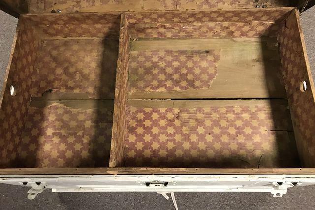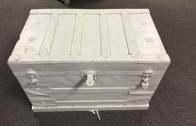 Antique painted streamer trunk, white, inner tray with paper lining, new handles, latches, 22"h., 32"w., 19"d. Antique painted streamer trunk, white, inner tray with paper lining, new handles, latches, 22"h., 32"w., 19"d.