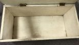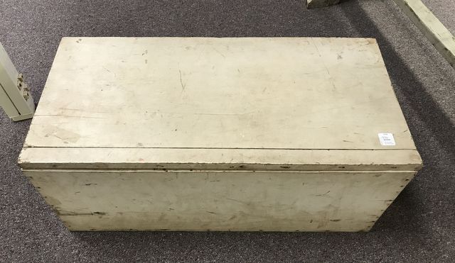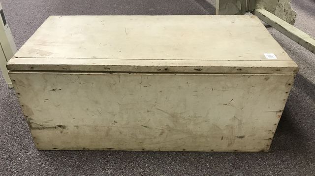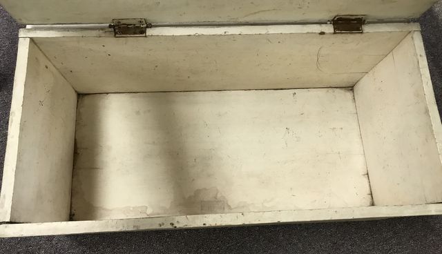 Hand Made wood storage crate, light top, painted white, 11"h., 26"w. Hand Made wood storage crate, light top, painted white, 11"h., 26"w.