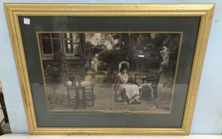 Print of English Tea Party, matted, gold gilt framed, 28"h., 36"w. Print of English Tea Party, matted, gold gilt framed, 28"h., 36"w.