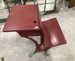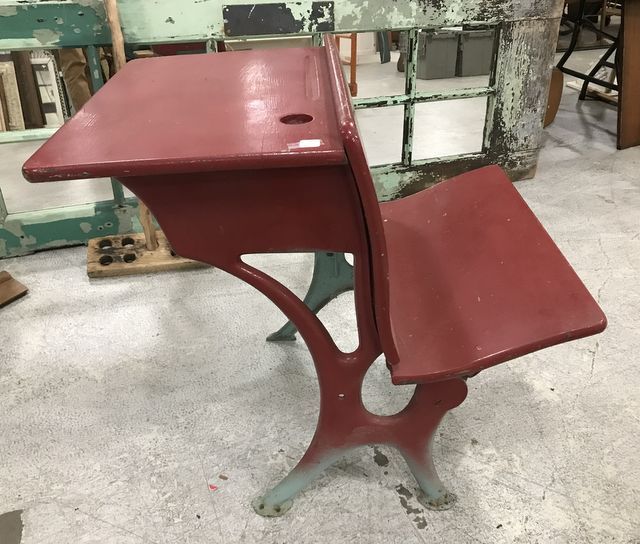 Painted Red School Desk, metal frame, wood seat and desk, 30"h. Painted Red School Desk, metal frame, wood seat and desk, 30"h.