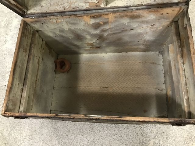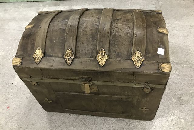 Vintage Dome Top streamer trunk, painted, metal shell, no inner tray, paper lining, no handles, 20"h., 16"w., 26"w. Vintage Dome Top streamer trunk, painted, metal shell, no inner tray, paper lining, no handles, 20"h., 16"w., 26"w.