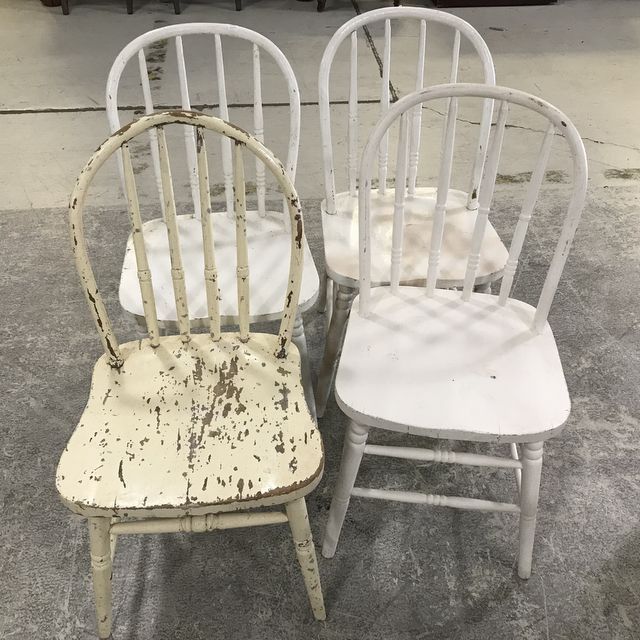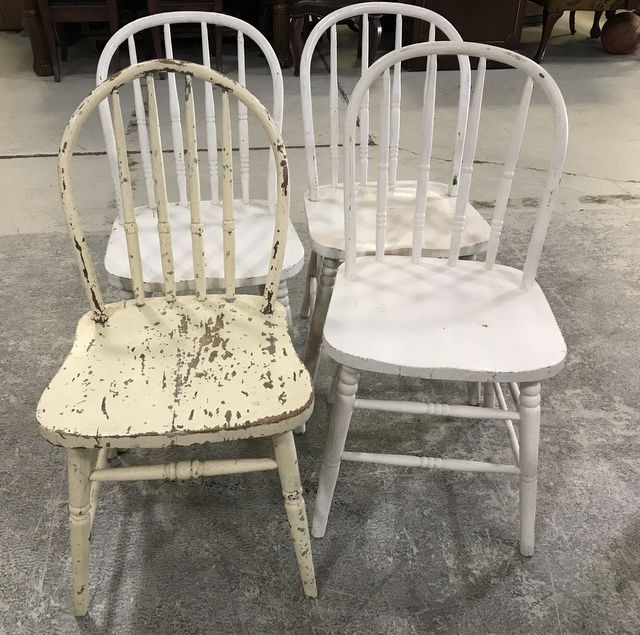 Set of Four Bow-Back Old Side Chairs, painted white, age wear, spindle back, one is off white, 33"h. Set of Four Bow-Back Old Side Chairs, painted white, age wear, spindle back, one is off white, 33"h.