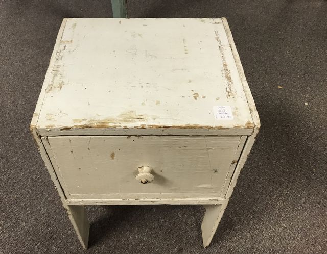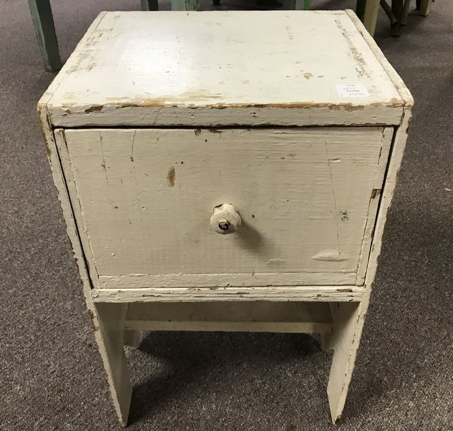 Small painted white single drawer stand, has wear, 19"h., 12"w., 10"d. Small painted white single drawer stand, has wear, 19"h., 12"w., 10"d.