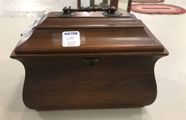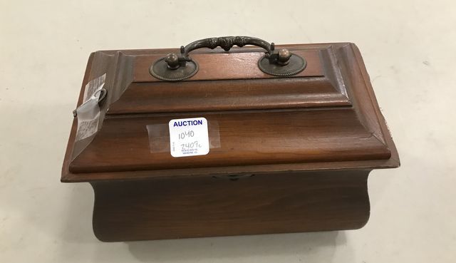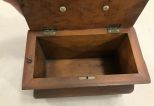 Wooden storage box with key, handled, 5"h., 9"w. Wooden storage box with key, handled, 5"h., 9"w.