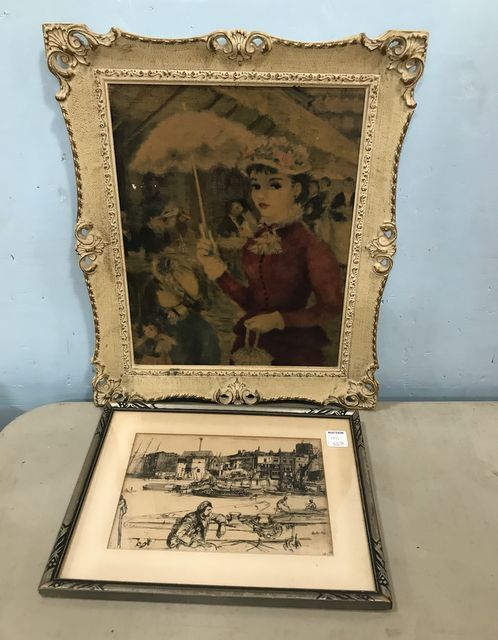Ornate wood framed lady print 18"h., 14"w., small fisherman bay print by Whistler framed 10"h., 13"w. Ornate wood framed lady print 18"h., 14"w., small fisherman bay print by Whistler framed 10"h., 13"w.