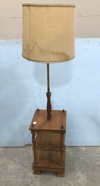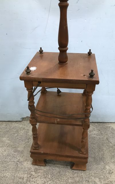 Vintage Maple Lamp Table, brass rod, three tier, 58"h. Vintage Maple Lamp Table, brass rod, three tier, 58"h.