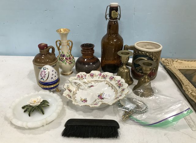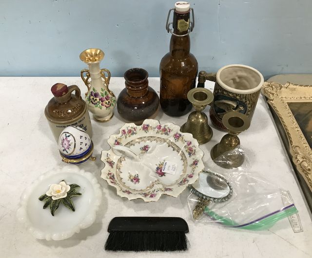 Divided porcelain dish, porcelain egg, hand painted vase, stoneware jug, ceramic mug, vintage glass bottle, small ornate mirror, brass candle holder. Divided porcelain dish, porcelain egg, hand painted vase, stoneware jug, ceramic mug, vintage glass bottle, small ornate mirror, brass candle holder.