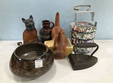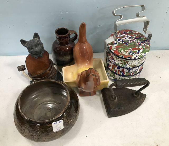 Vintage hand painted dog planter, modern cat lamp, vintage iron press, stoneware bowl and jug, painted tins. Vintage hand painted dog planter, modern cat lamp, vintage iron press, stoneware bowl and jug, painted tins.