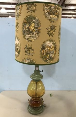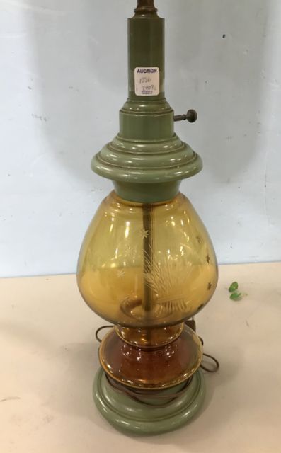Amber color vintage etched glass lamp, green painted frame, Early American style shade, 36"h. Amber color vintage etched glass lamp, green painted frame, Early American style shade, 36"h.