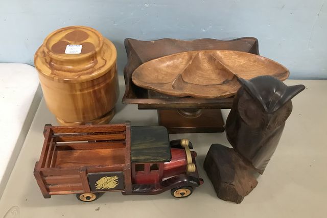Wood Carved Owl, wood compote, wood divided tray, wood antique truck, wood hand made container. Wood Carved Owl, wood compote, wood divided tray, wood antique truck, wood hand made container.