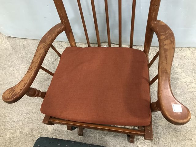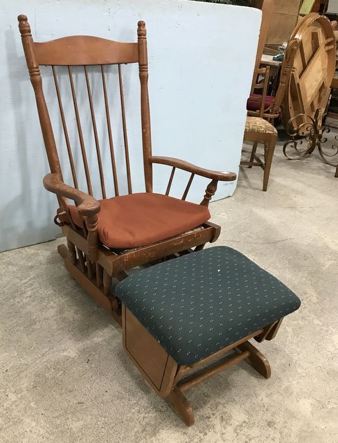 Vintage Platform Rocker with Glider Ottoman, has cushion, finish is worn. Vintage Platform Rocker with Glider Ottoman, has cushion, finish is worn.