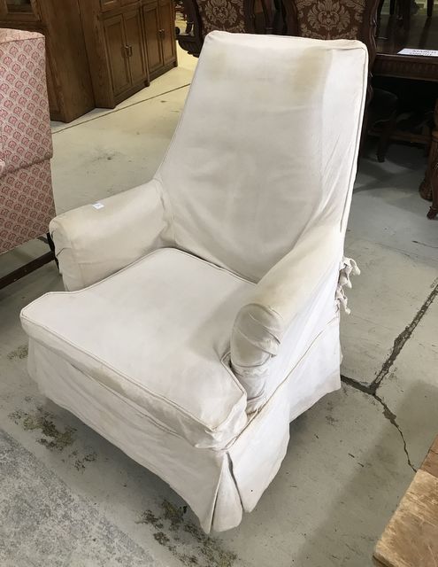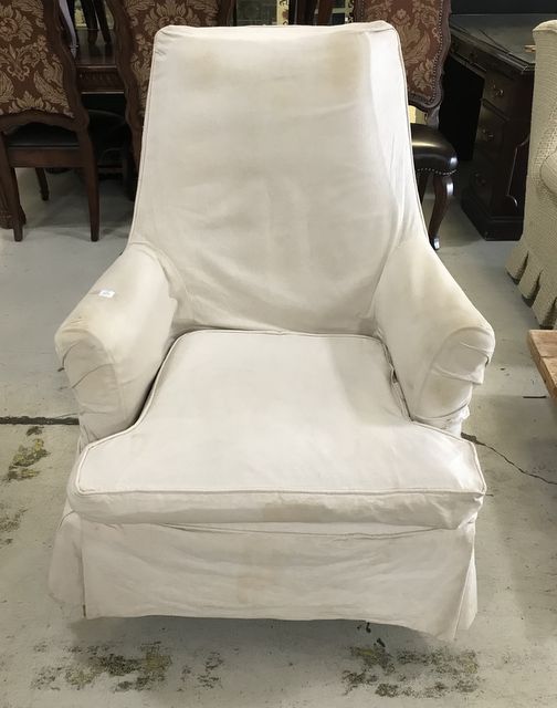 White slip cover (needs cleaning) arm chair, 1950's-1960's green upholstery, 40"h. White slip cover (needs cleaning) arm chair, 1950's-1960's green upholstery, 40"h.