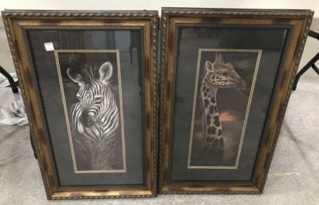 Giraffe and Zebra Print, distressed framed, matted, 30"h., 18"w. Giraffe and Zebra Print, distressed framed, matted, 30"h., 18"w.