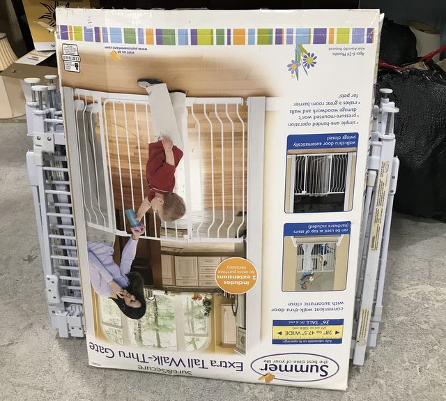 Summer Extra Tall Walk Thru Gates, 5 total, has parts in pieces in box. Summer Extra Tall Walk Thru Gates, 5 total, has parts in pieces in box.
