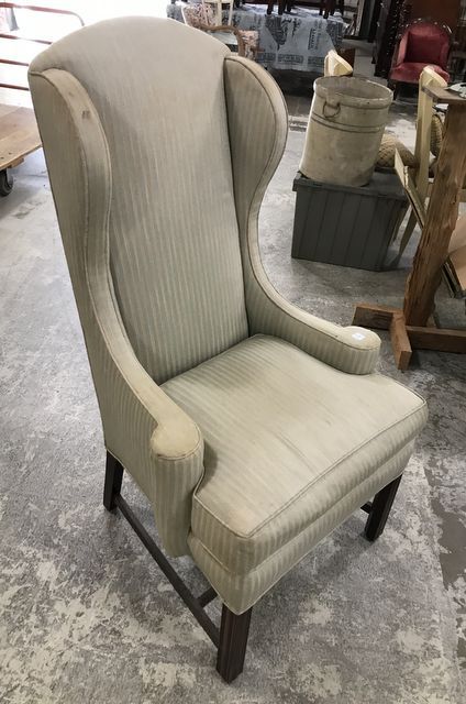 Chippendale Style Ladies Wing Back Arm Chair, striped pattern, needs cleanings, 46"h. Chippendale Style Ladies Wing Back Arm Chair, striped pattern, needs cleanings, 46"h.