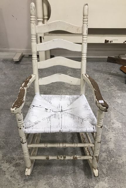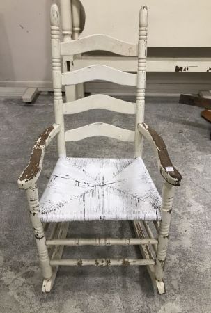 Vintage painted slat back rocker, arms, painted woven seat, oak, distressed, 42"h. Vintage painted slat back rocker, arms, painted woven seat, oak, distressed, 42"h.