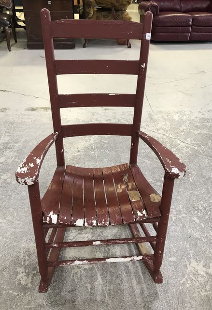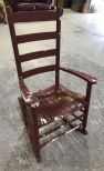 Antique Shaker style rocking chair, thin ladder back, painted red, age wear, 41"h. Antique Shaker style rocking chair, thin ladder back, painted red, age wear, 41"h.