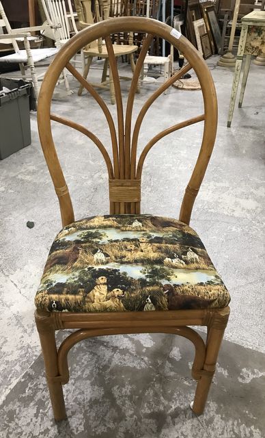 Bent Bamboo style chair, dog fabric cushion, have some wear, 38"h. Bent Bamboo style chair, dog fabric cushion, have some wear, 38"h.