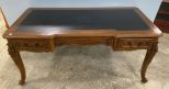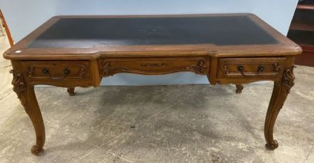 Antique Reproduction French Writing Desk, leather inset top, three drawers, has light scratches, 29"h., 66"w., 33"d. Antique Reproduction French Writing Desk, leather inset top, three drawers, has light scratches, 29"h., 66"w., 33"d.