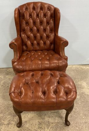 North Hickory Furniture Regal Leather Chair and Ottoman, button tufted, Queen Anne, used condition. North Hickory Furniture Regal Leather Chair and Ottoman, button tufted, Queen Anne, used condition.