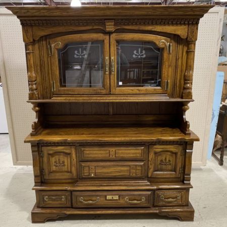 1980's Oak Finish Hutch, two pieces, top with glass door, base has five drawers, two doors, missing back to base, several missing hardware, 75"h., 60"w. 19"d. 1980's Oak Finish Hutch, two pieces, top with glass door, base has five drawers, two doors, missing back to base, several missing hardware, 75"h., 60"w. 19"d.