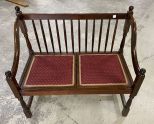 Colonial Style Cherry Waiting Bench, spindle back, two section cushion seats, 35"h., 37"w. Colonial Style Cherry Waiting Bench, spindle back, two section cushion seats, 35"h., 37"w.