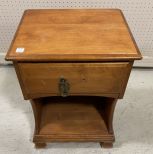 Maple Early American Style Night Stand, single drawer, pull needs screw, open front, has wear, 27"h., 18"w., 14"d. Maple Early American Style Night Stand, single drawer, pull needs screw, open front, has wear, 27"h., 18"w., 14"d.