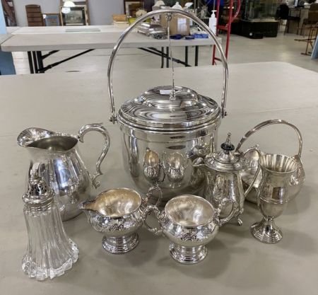 Group of Silver Plate Serving Pieces, Silver Plate ice bucket, Reed & Barton pitcher, cheese shaker, Gorham creamer & sugar, Two's Company Vase, Syrup pitcher, basket. Group of Silver Plate Serving Pieces, Silver Plate ice bucket, Reed & Barton pitcher, cheese shaker, Gorham creamer & sugar, Two's Company Vase, Syrup pitcher, basket.