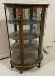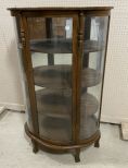 Oak Curved Glass Curio Cabinet, mirrored back, three shelves, 56"h., 34"w., 14"d. Oak Curved Glass Curio Cabinet, mirrored back, three shelves, 56"h., 34"w., 14"d.