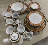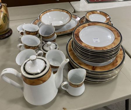 Retroneu "Wood Garland" China Set, 8 dinner plates, 9 salad plates, pitcher, creamer, sugar, cups, platter, salad bowl, saucers, bowls. Retroneu "Wood Garland" China Set, 8 dinner plates, 9 salad plates, pitcher, creamer, sugar, cups, platter, salad bowl, saucers, bowls.