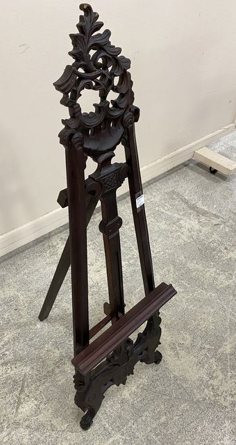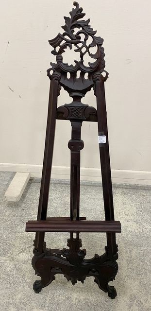 Small Mahogany carved easel, adjustable, 4' tall. Small Mahogany carved easel, adjustable, 4' tall.
