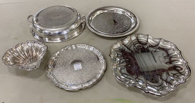 Five Silver Plate serving pieces, Two WM Rogers plates, tray, silver plate covered lid, monogramed, Reed & Barton Silver Plate tray, Shell silver plate footed bowl. Five Silver Plate serving pieces, Two WM Rogers plates, tray, silver plate covered lid, monogramed, Reed & Barton Silver Plate tray, Shell silver plate footed bowl.