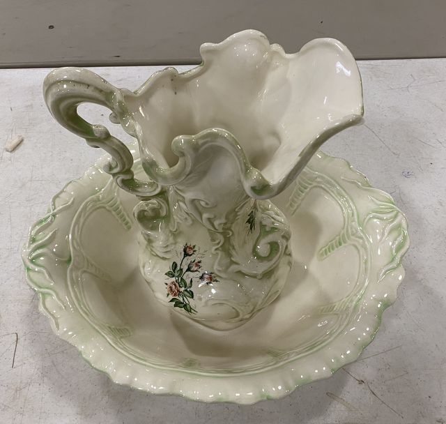Ceramic Pitcher and Bowl by Charlene Mathiston, hand painted, 16" bowl, 12"h pitcher. Ceramic Pitcher and Bowl by Charlene Mathiston, hand painted, 16" bowl, 12"h pitcher.