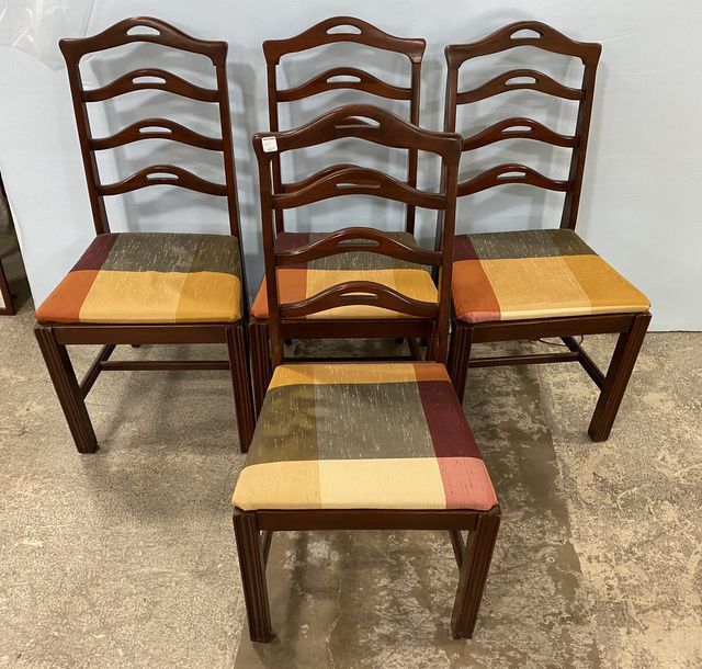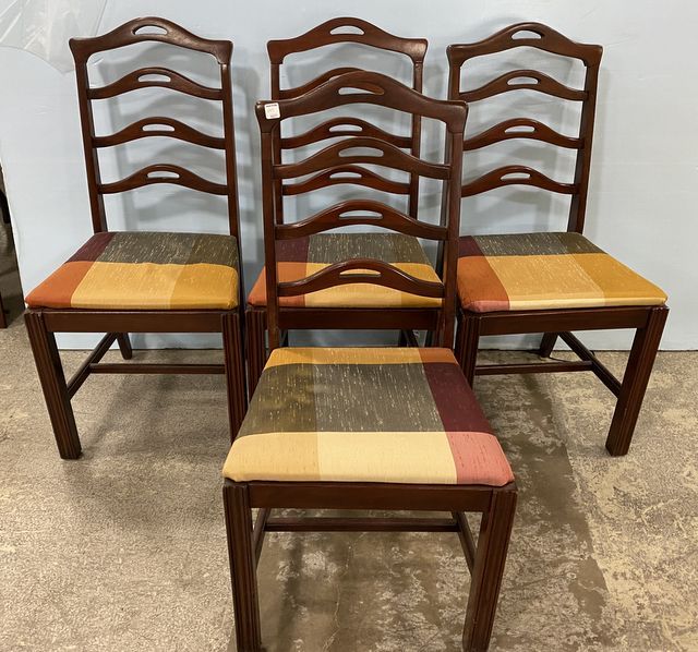 Four Vintage Mahogany Dining Side Chairs, clean fabric, some need tightening. Four Vintage Mahogany Dining Side Chairs, clean fabric, some need tightening.