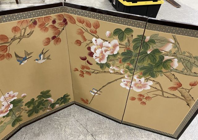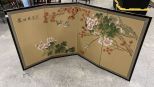Four Panel Oriental Screen, folding screen, signed, printed, each panel is 35"h., 17"w. Four Panel Oriental Screen, folding screen, signed, printed, each panel is 35"h., 17"w.